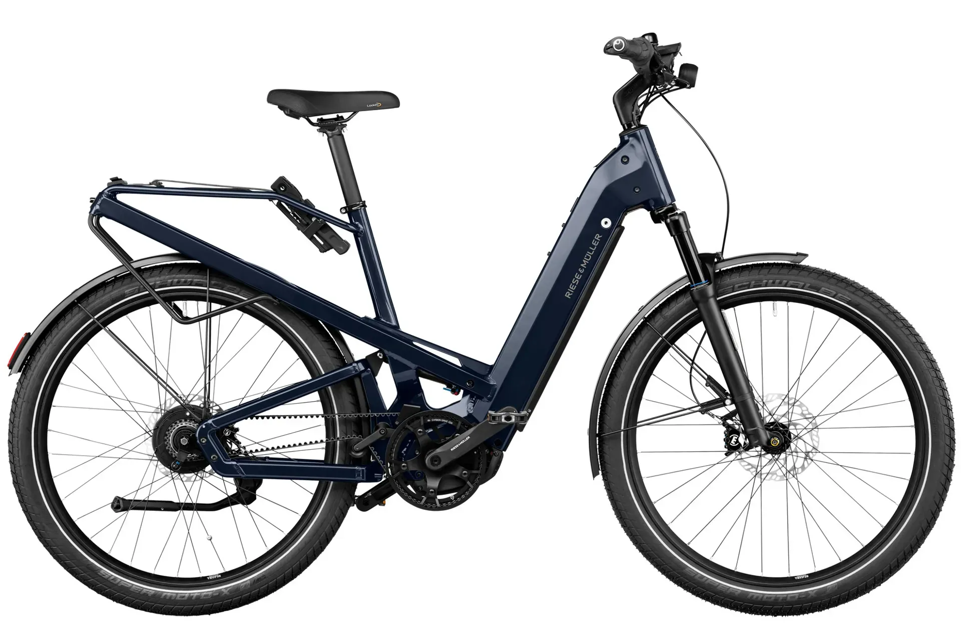 Comfort and dynamism take centre stage with the Homage: whether while riding, charging the batteries or locking it up in the city, the full-suspension low-step-through bike offers maximum comfort at all times. The ergonomically positioned charging socket and the specially developed closing cap ensure convenient charging directly on the bike. The lock is also ergonomically attached to the carrier, ensuring quick locking and unlocking. And if you perhaps want a little more, you might opt for the comfort kit with curved handlebars and wide saddle or a saddle that can be lowered by remote control.